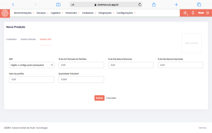 Caso o produto seja relacionado a GLP, preencha os campos da aba correspondente: