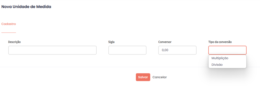 - Configurar conversão: Defina o tipo de conversão (Multiplicação ou Divisão) e o fator correspondente para ajustar automaticamente estoque e custo.