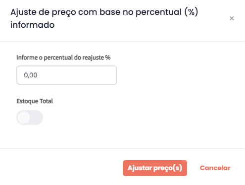• Reajuste global: Acesse Mais opções > Reajuste de preço e utilize a opção Estoque total.