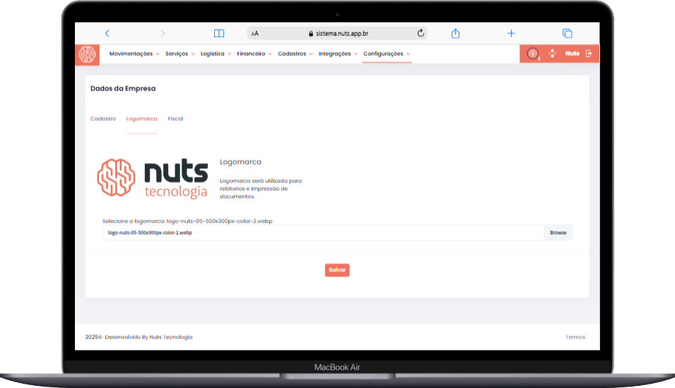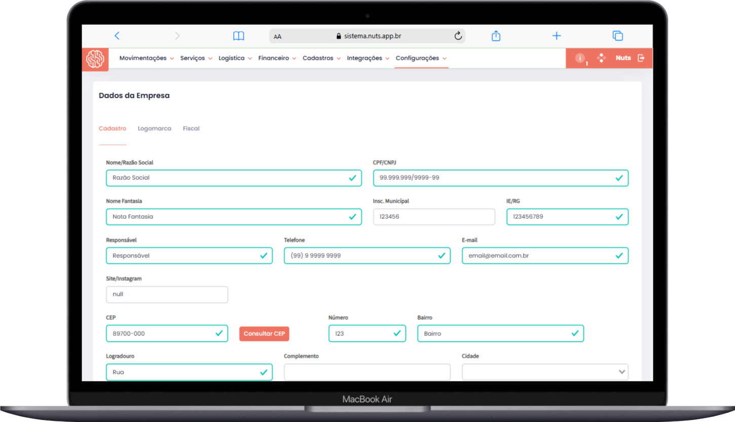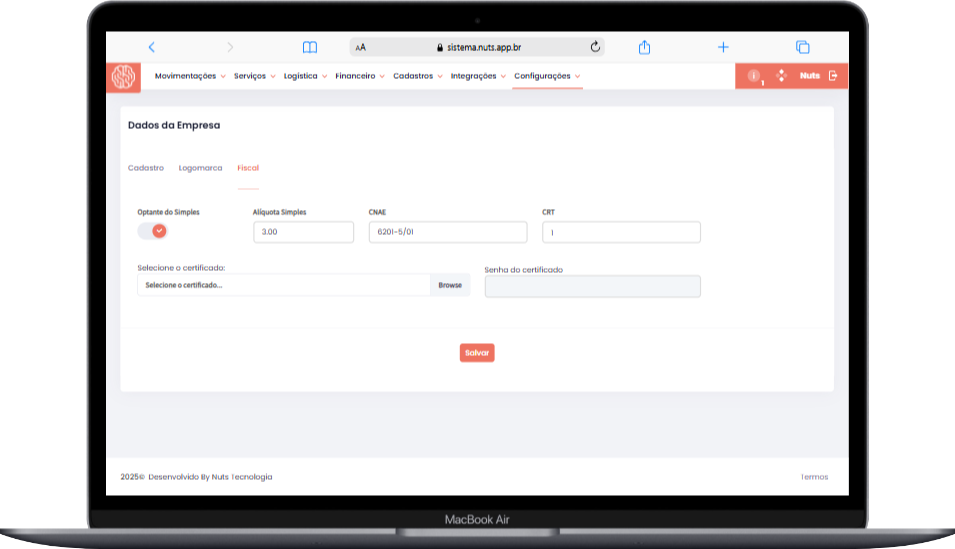 Certifique-se de revisar os dados preenchidos antes de salvar. Com essas informações configuradas corretamente, sua empresa estará pronta para emitir notas e gerar documentos de forma integrada e segura no Sistema Nuts. 🚀