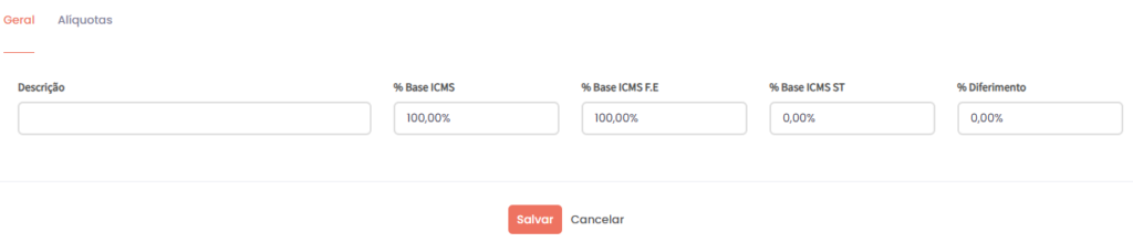 - % Base ICMS: Porcentagem da base de cálculo para o ICMS. Exemplo: 100% indica que a alíquota será calculada sobre o valor total do produto.