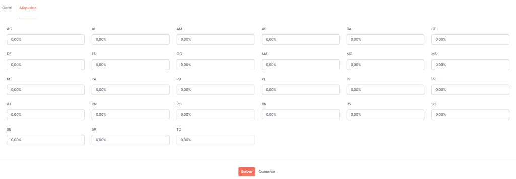 - Na aba Alíquotas, configure as alíquotas para cada estado: