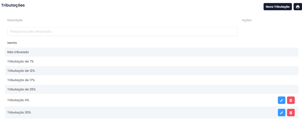 Nota: Tributações padrão que já estão cadastradas no sistema não podem ser editadas ou excluídas.