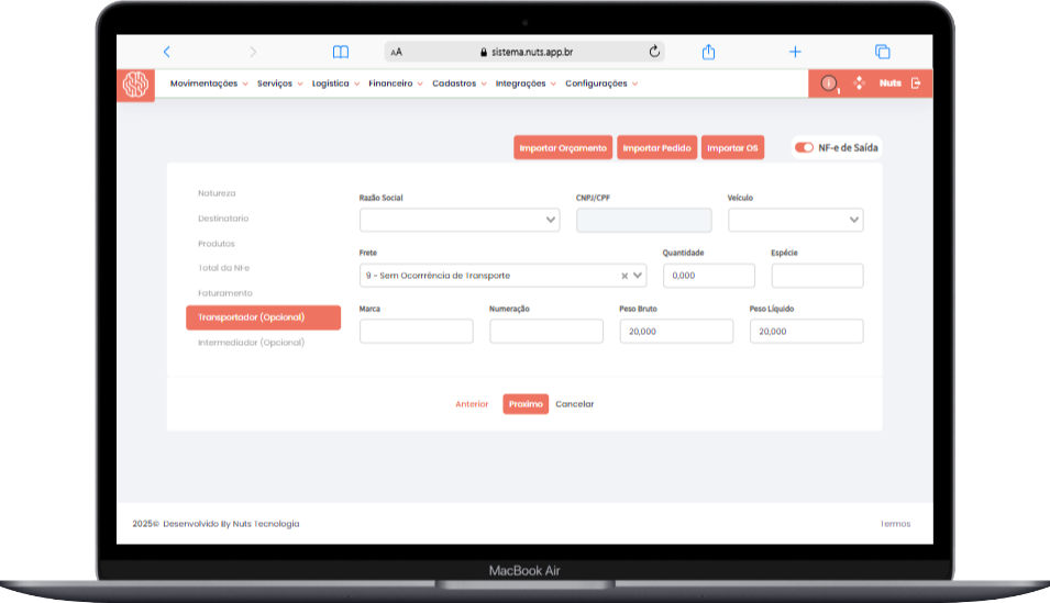 • Transportadora, Tipo de Frete, Quantidade, Espécie, Marca, Numeração, Peso Bruto e Peso Líquido.
