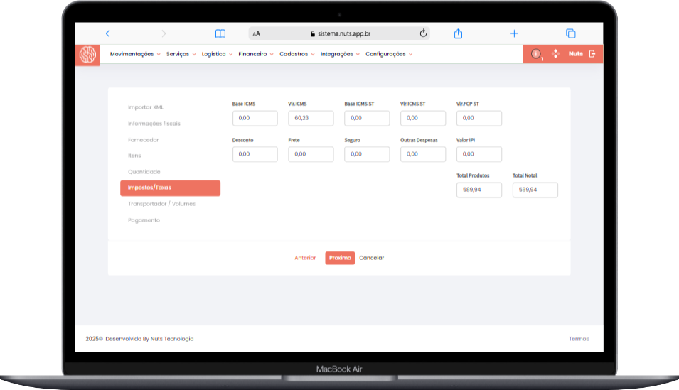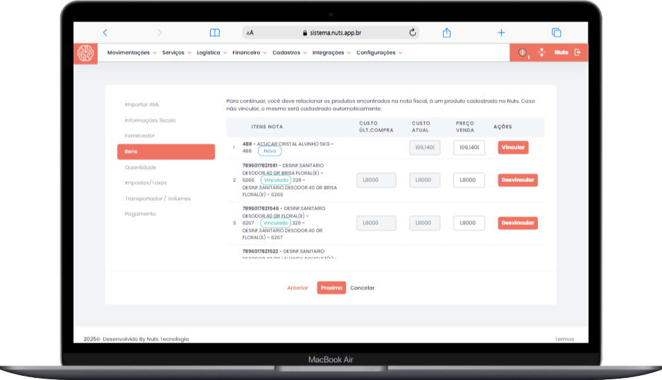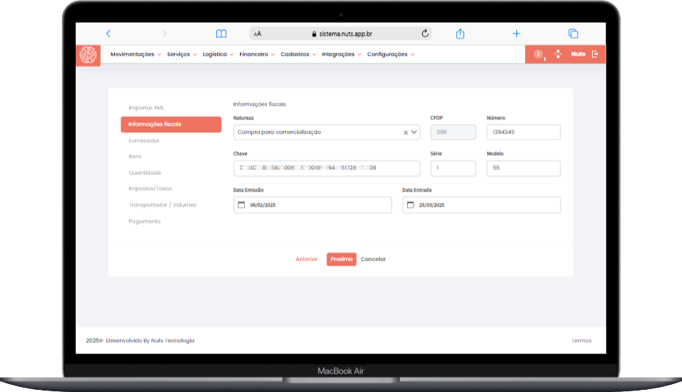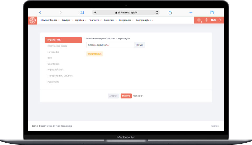 O sistema Nuts permite a importação de notas fiscais de compra de mercadorias e outras NF-es onde sua empresa é o destinatário, utilizando arquivos XML. Essa funcionalidade agiliza a gestão de compras e evita erros manuais.