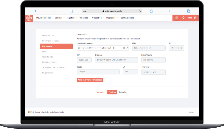 - O sistema identificará automaticamente o Fornecedor/Emitente da nota.