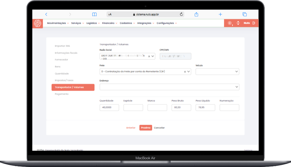 - Os dados do transportador, volumes e demais informações logísticas serão exibidos para conferência.