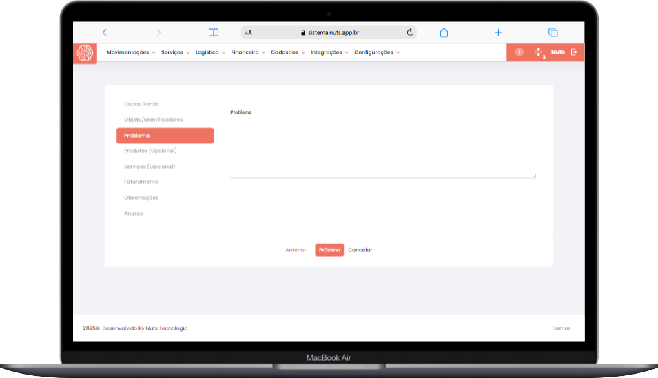 • Campo de descrição do problema informado pelo cliente.