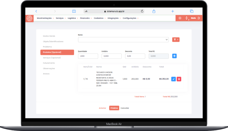 • Definição de quantidade e valor unitário.