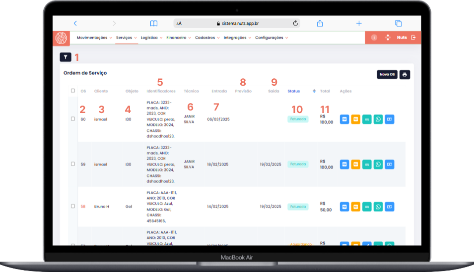 No Grid, é possível acompanhar todas as OS emitidas com as seguintes informações: